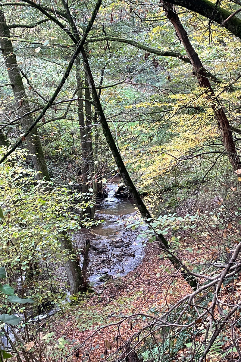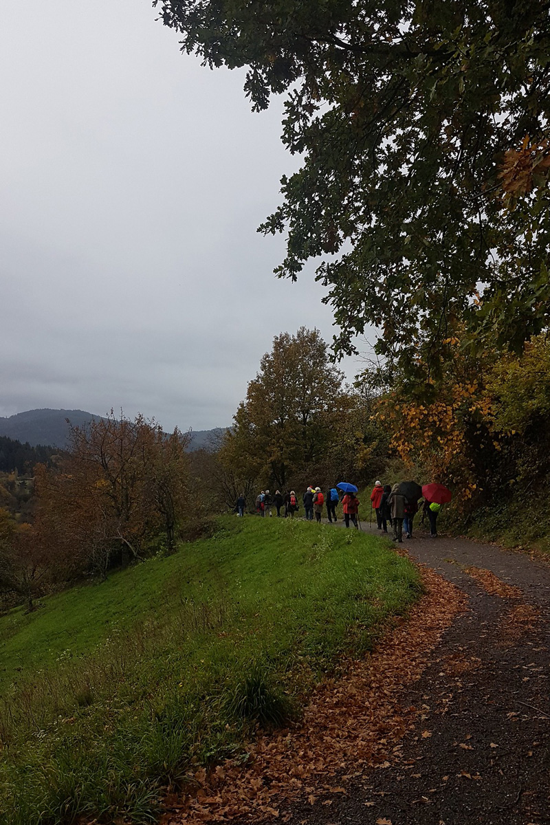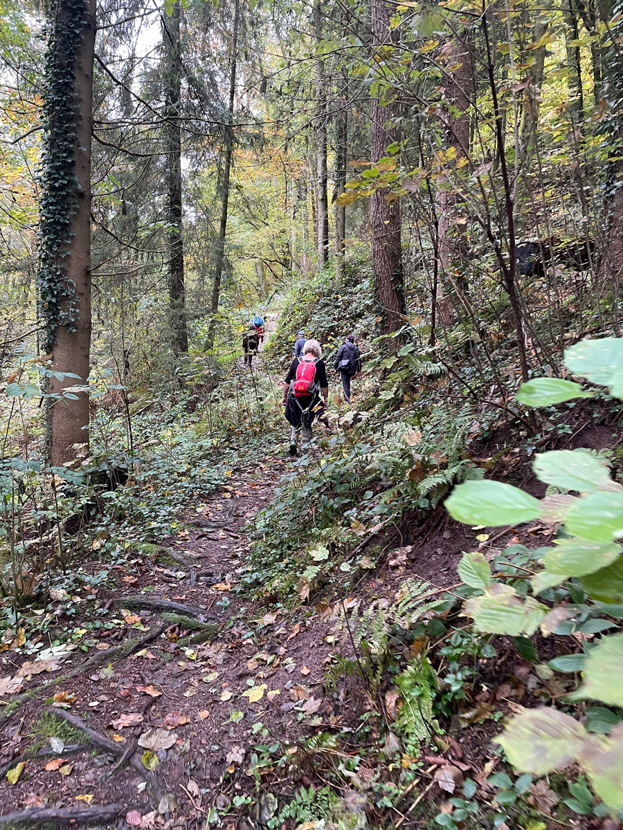 Bei bedecktem Himmel und teilweise Nieselregen aber guter Laune, ging es auf blätterbedeckten Waldpfaden den Berg hinauf.