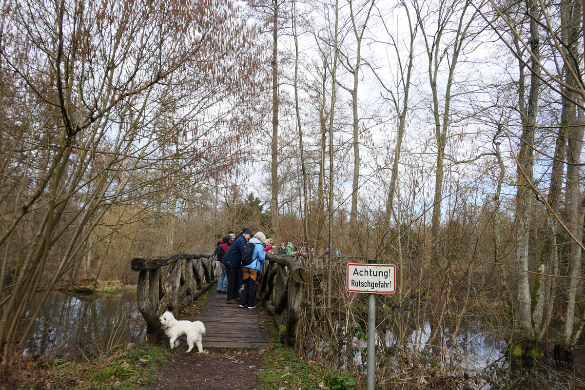Dort begann die Wanderung. Es ging entlang dem Altfederbach und dann über eine lange geschwungene Holzbrücke über das „Rossloch“ in Richtung Waldhütte Steinmauern.