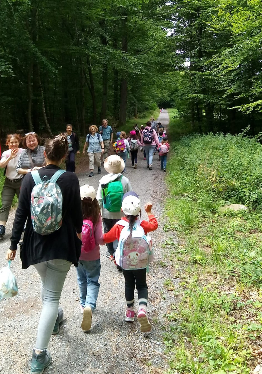 Gleich zu Beginn wurden wir von einer fröhlich winkenden Kinderschar im Wald begrüßt. Die Wanderung im dichten Grün des Waldes ist auch an warmen Tagen gut machbar. Bei der Rast gab es eine Stärkung für alle.